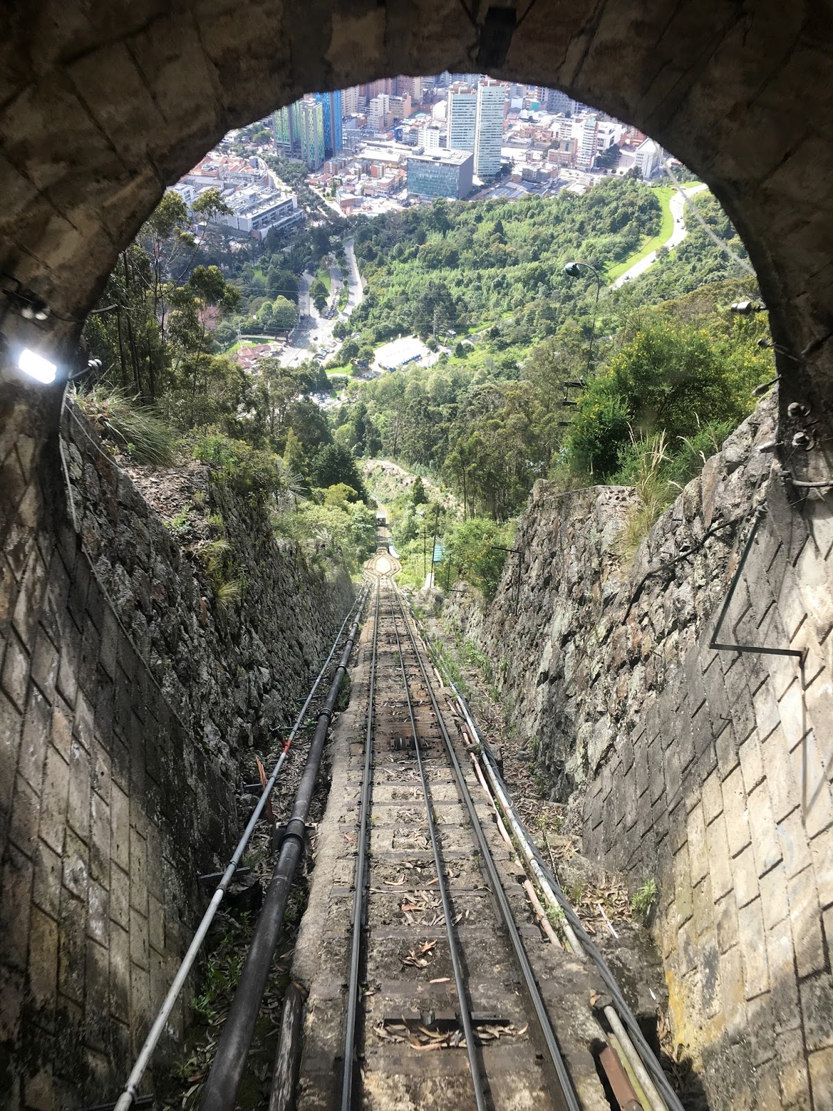 There is a funicular to the famous Monserrate Mountain, the altitude would probably kill you if you had to walk it up. Rather walk down, you will enjoy the view more. And there are truly exceptional views of Bogota and its surroundings.